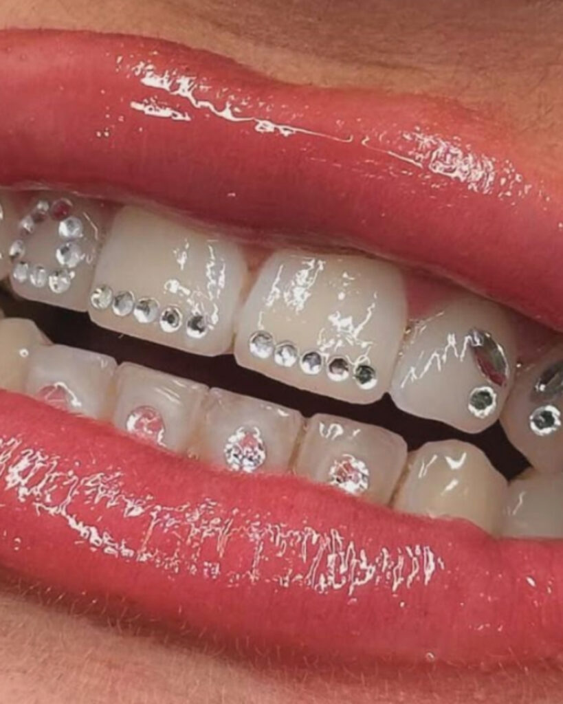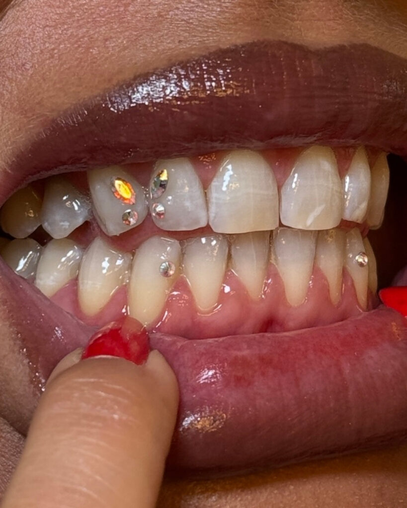 Viele lassen zuerst die Zähne aufhellen und bringen direkt im Anschluss Zahnschmuck an, da dieser auf helleren Zähnen besonders gut wirkt.